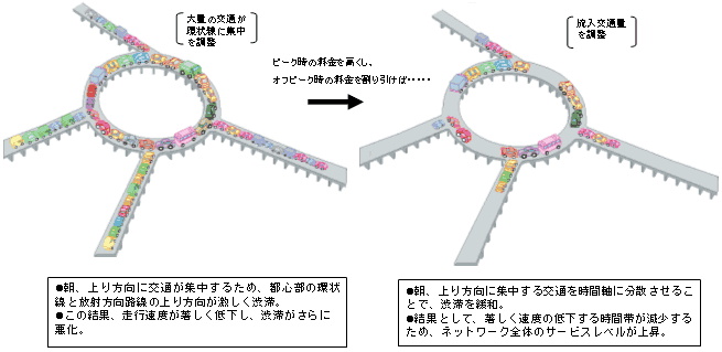 ・乗用車 超閑散時 9:00〜11:00 (-35%) 閑散時 11:00〜11:00 (-15%) 0:00〜3:00 混雑時 17:00〜21:00 (+25%) 通常時 上記以外の時間 (±0%) ・大型車 超閑散時 0:00〜 3:00 (-35%) 混雑時 17:00〜21:00 (+25%) 交通分散効果 ピーク時交通量 4〜8%減少