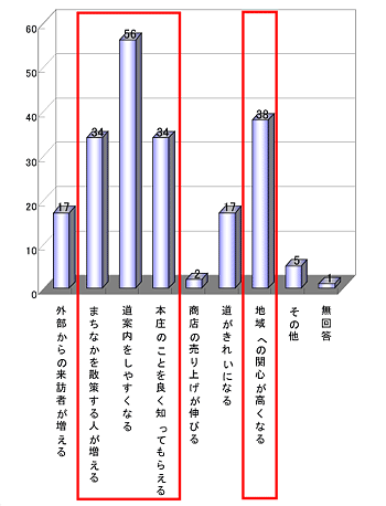 通り名で道案内を導入することで今後地域がどう変わるかについて、「道案内をしやすくなる」、「地域への関心が高くなる」、「地域のことを良く知ってもらえる」、「まちなかを散策する人が増える」等の回答が多数