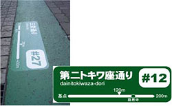 現地の標示は通り名と位置番号に加え、基終点と現在地との位置関係が分りやすいように工夫しました。