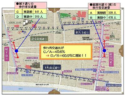 社会実験による来訪者の行動の変化を 把握するため、実験前と実験中の歩行 者交通量の調査を行いました。