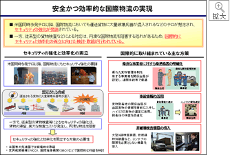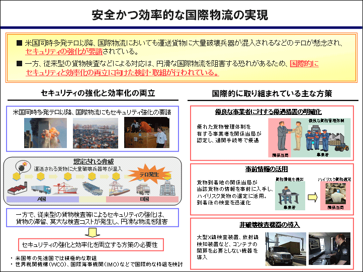 • 同時多発テロ以降、国際物流は、大量破壊兵器の拡散への悪用や、世界経済の混乱を狙うテロの標的とされうることが懸念され、セキュリティの強化が強く要請されています。