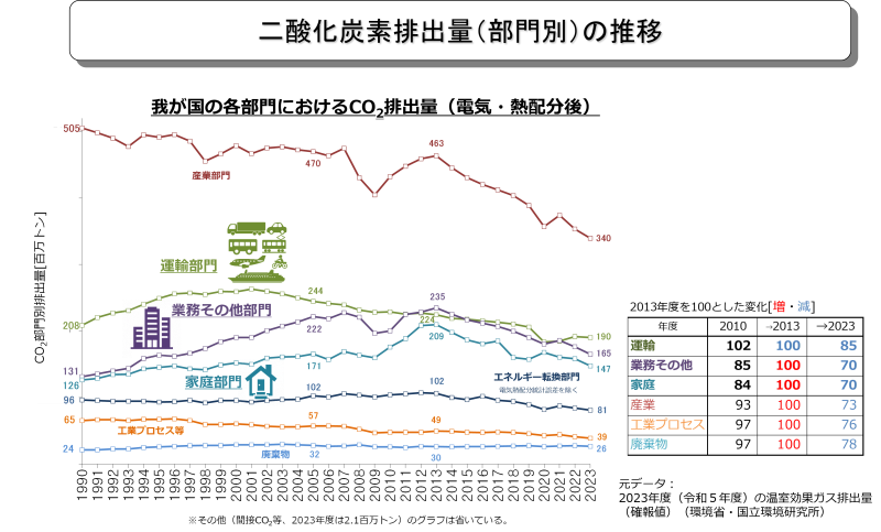 2023年度の我が国の温室効果ガス排出量(確報値)は、10億7,100万トン(CO2換算、前年度比-4.0%、2013年度比-23.3%)でした。