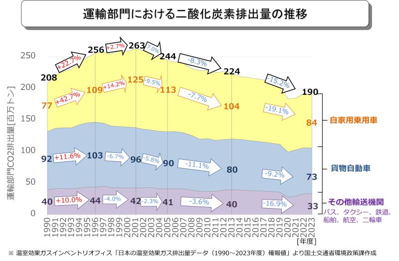 2023年度における日本の二酸化炭素排出量(9億8,900万トン)のうち、運輸部門からの排出量(1億9,014万トン)は19.2%を占めています。自動車全体では運輸部門の85.7%(日本全体の16.5%)、うち、旅客自動車が運輸部門の47.4%(日本全体の9.1%)、貨物自動車が運輸部門の38.3%(日本全体の7.4%)を排出しています。