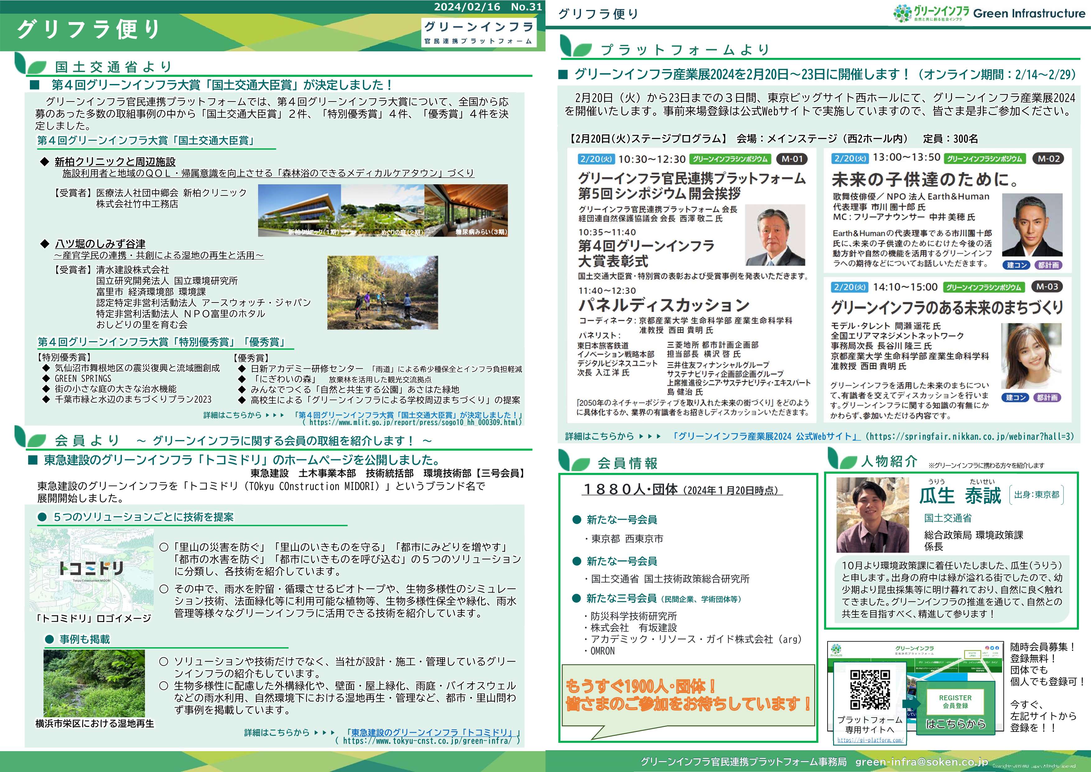 ●国土交通省より ・第4回グリーンインフラ大賞「国土交通大臣賞」が決定しました! ●会員より ・東急建設のグリーンインフラ「トコミドリ」のホームページを公開しました。 ●プラットフォームより ・グリーンインフラ産業展2024を2月20日~23日に開催します! ・国土交通省 総合政策局環境政策課 係長 瓜生泰誠氏 |