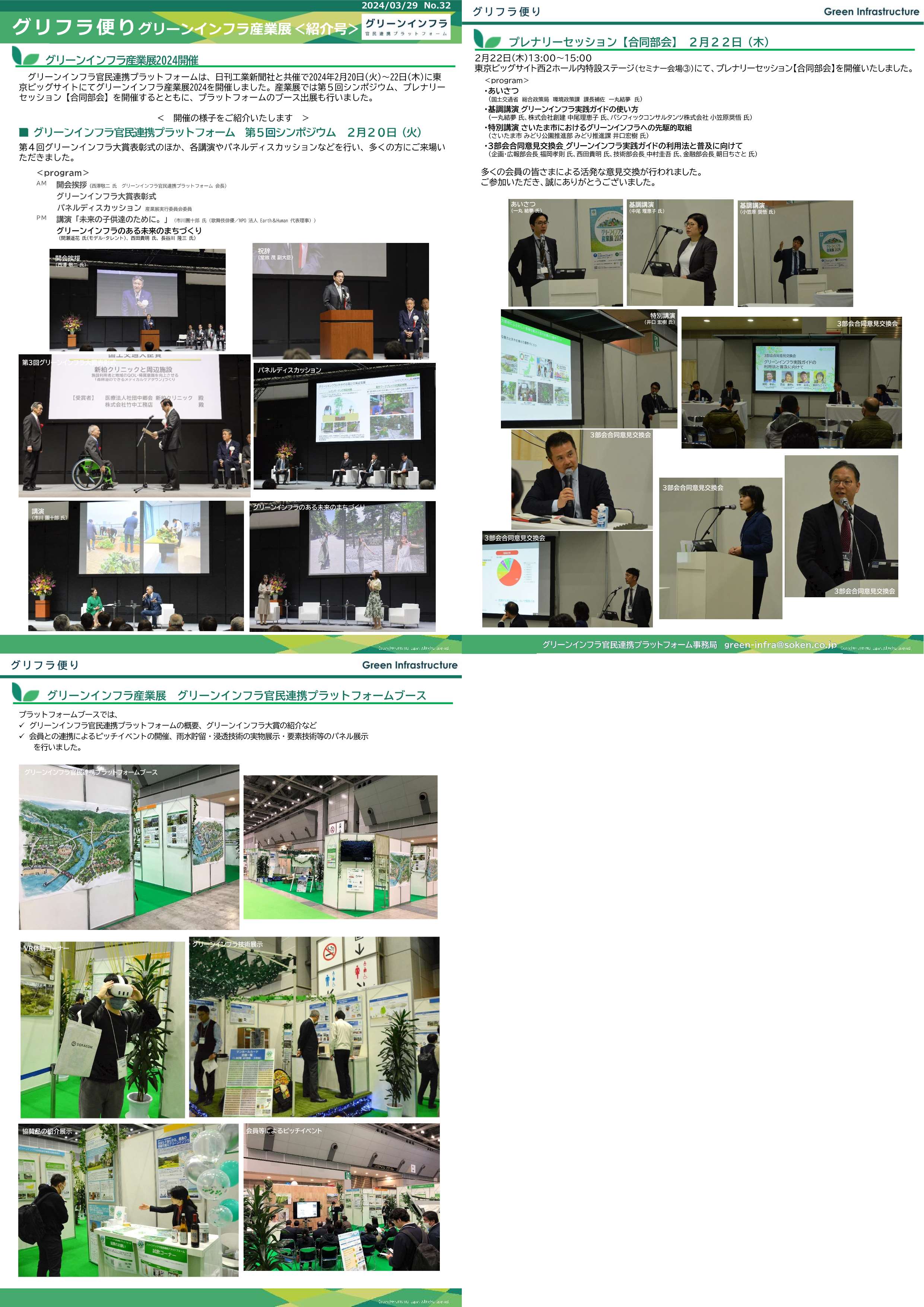 グリーンインフラ産業展<紹介号> ●グリーンインフラ産業展2024開催 ・グリーンインフラ官民連携プラットフォーム 第5回シンポジウム 2月20日(火) <program> ●プレナリーセッション【合同部会】 2月22日(木) <program> ●グリーンインフラ産業展 グリーンインフラ官民連携プラットフォームブース |