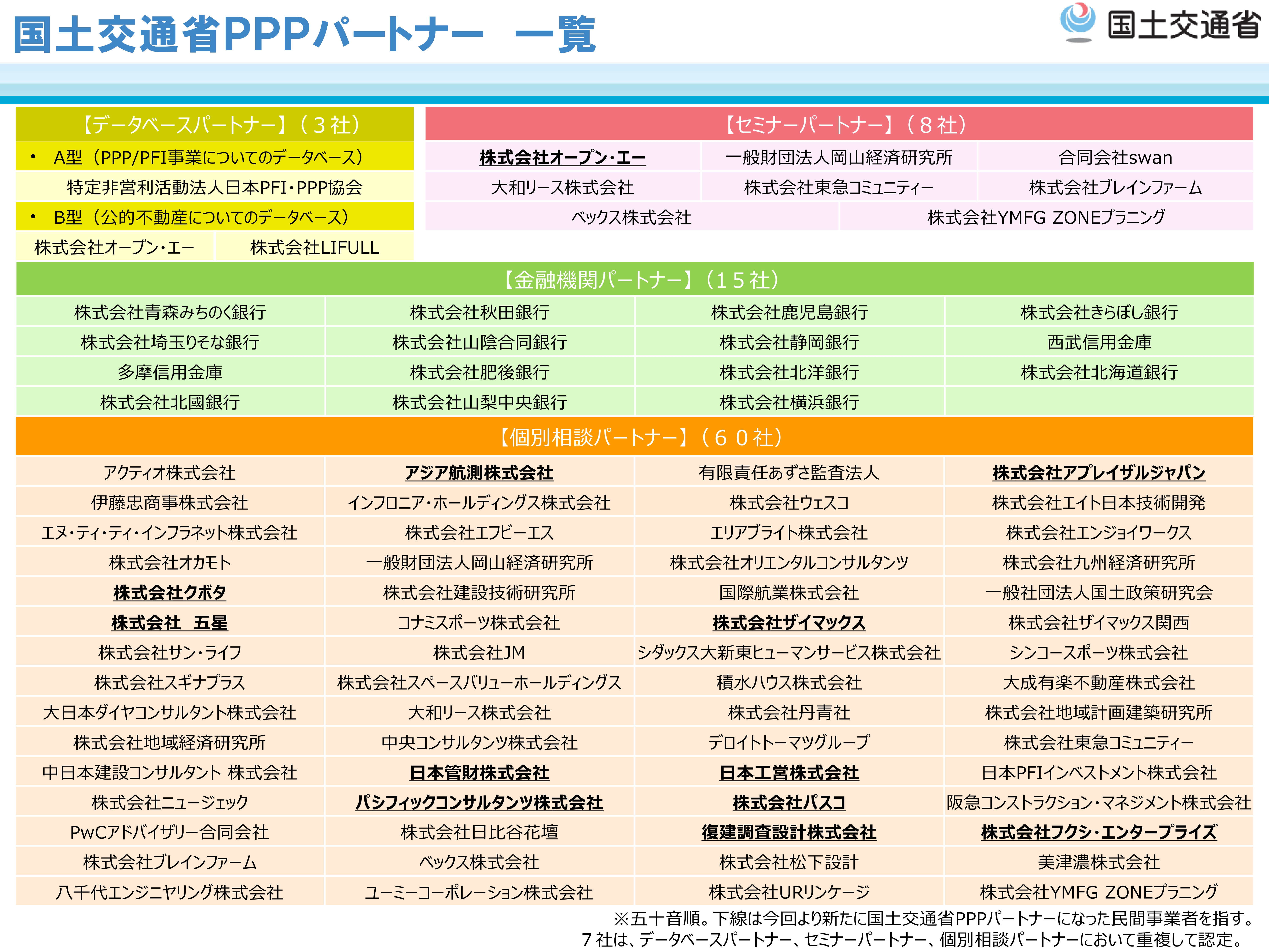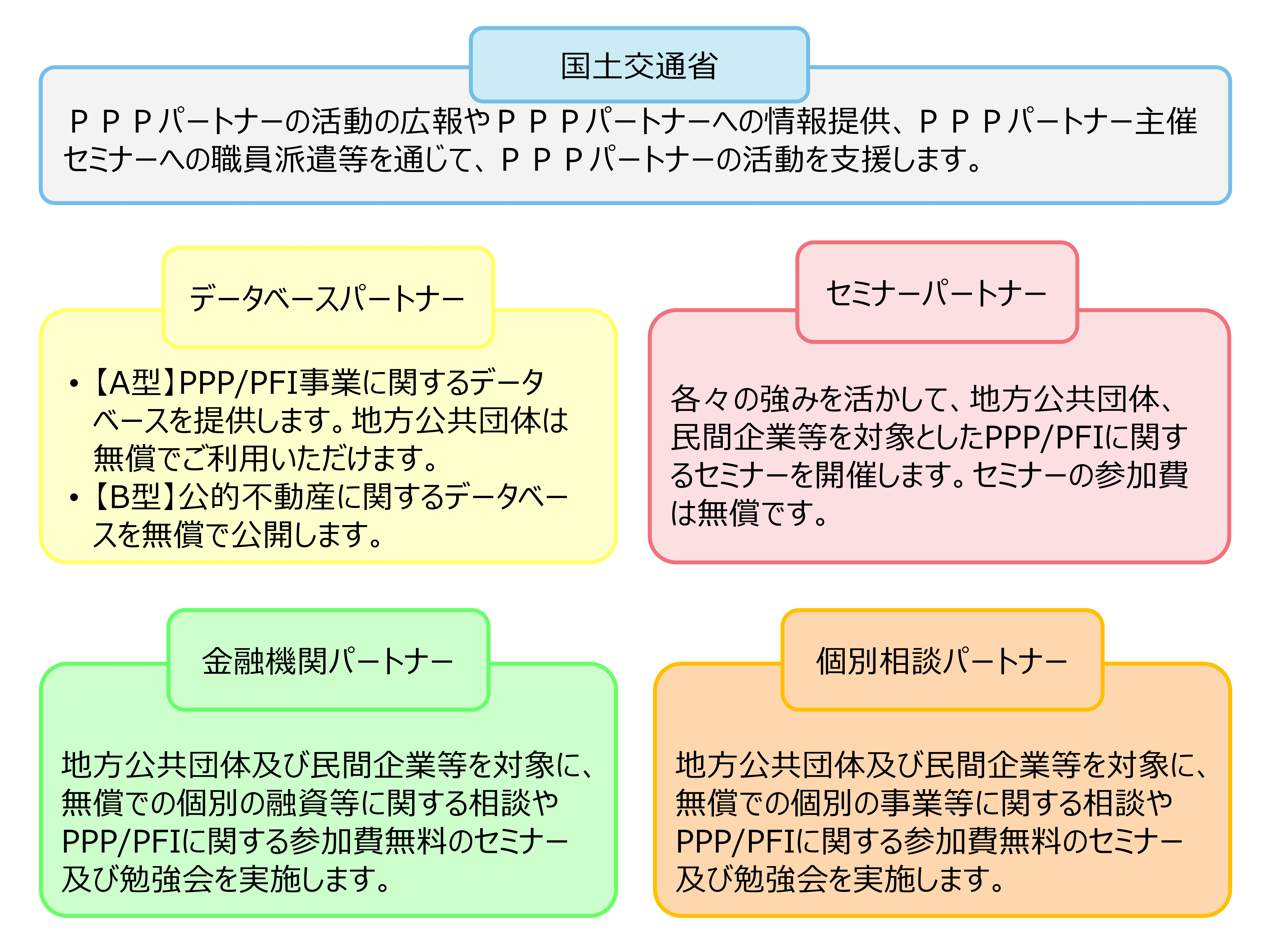 国土交通省は、PPP/PFIの普及・啓発を効率的かつ効果的に推進する民間企業等を、国土交通省PPPパートナー(データベースパートナー、セミナーパートナー、金融機関パートナー及び個別相談パートナー)に認定、PPP/PFI 推進に係る民間事業者の取組を後押しすることにより、地方公共団体における PPP/PFI の一層の推進を図っていきます。