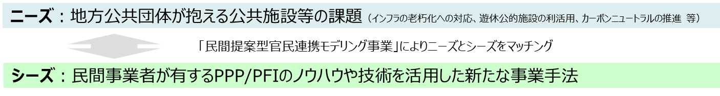 ○ 「民間提案型官民連携モデリング事業」は、地方公共団体が抱える課題(ニーズ)を、民間事業者から提案された新たな官民連携手法(シーズ)により解決することを目指す取組です。