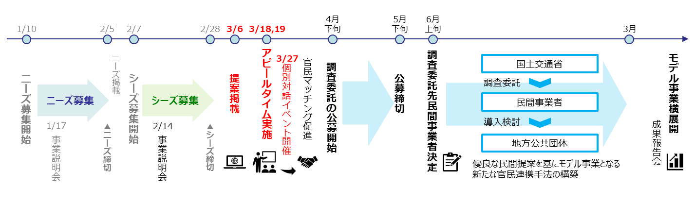 ○ 官民双方からのニーズ・シーズの提案をそれぞれがアピールし、ニーズとシーズをマッチングさせるイベントを経て、国土交通省では、新たな官民連携手法に関する調査委託の公募を行い、調査委託先となる民間事業者及び導入検討対象の地方公共団体を選定した後、導入検討を行う予定です。