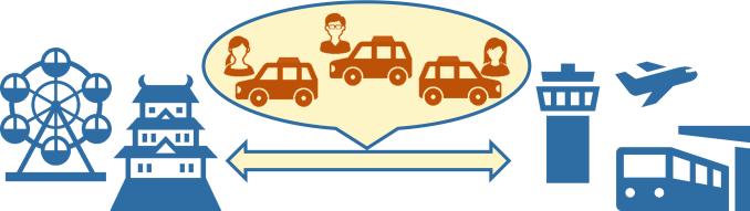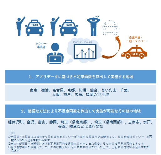 タクシー配車アプリデータ等を活用して、タクシーが不足する地域・時期・時間帯を特定し、地域の自家用車・一般ドライバーを活用して不足分を供給します。