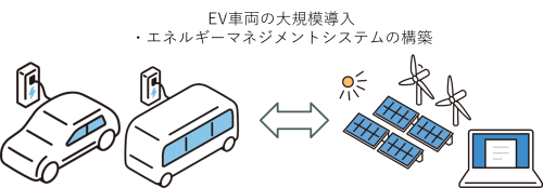 交通GXでは、EV車両の大規模導入、それらの車両の運行管理システムと充電管理を一体化させたエネルギーマネジメントシステムの構築に取り組んでいます。