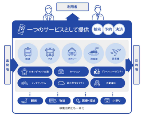 MaaS(マース:Mobility as a Service)とは、移動サービスと観光・医療などの目的地のサービスを最適に組み合わせて検索・予約・決済等を一括に行うことができるスマホアプリ・Webサービスです。