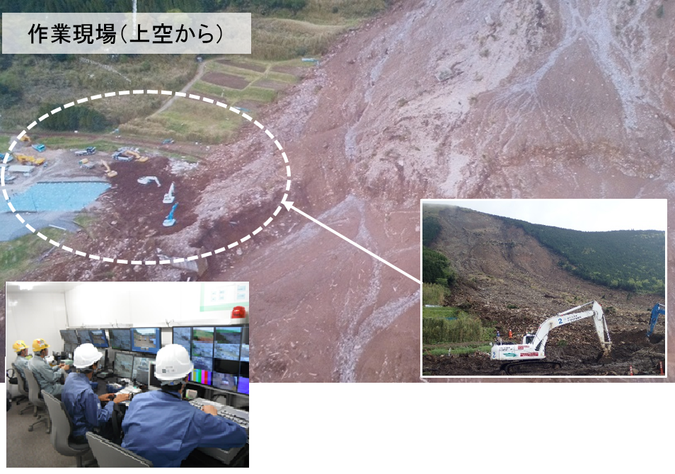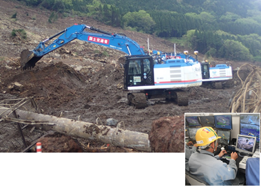•   【土砂崩れにおける遠隔操作による復旧作業状況】         【遠隔操作による復旧作業(H28熊本地震)】         【遠隔操作による復旧作業(H28熊本地震)】