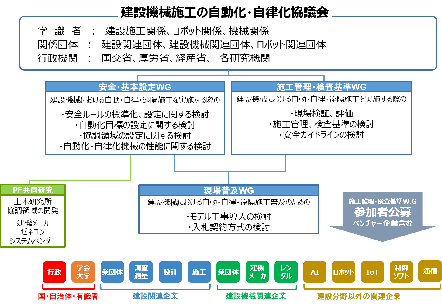 この状況下、急速に進展するデジタル技術を活用し、建設施工の自動化・自律化及び遠隔化の開発と試験導入が、大手建設企業、建設機械メーカ、ソフトウェアベンダーを中心に進められてきています。一方、これらの新たな技術に対しては、安全や開発面での統一的な基準がなく、現場毎の安全対応、各機器・システム毎の開発となっており、より効率的な開発及び普及環境の整備が求められています。