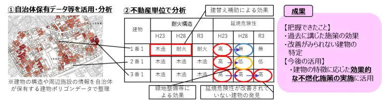 そこで建物の構造や周辺施設の情報を自治体が保有する建物ポリゴンデータで整理し、不動産単位で分析することで、過去に講じた施策の効果の把握や、改善がみられない建物の特定ができました。