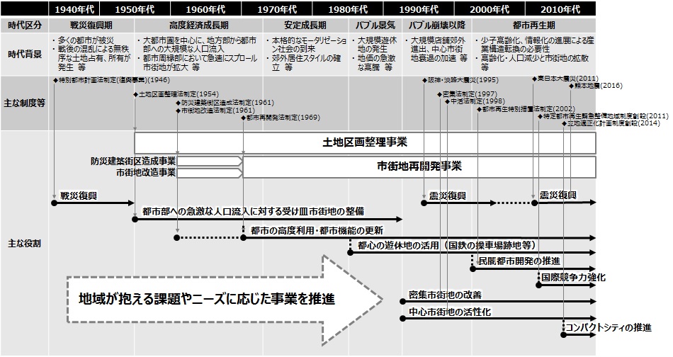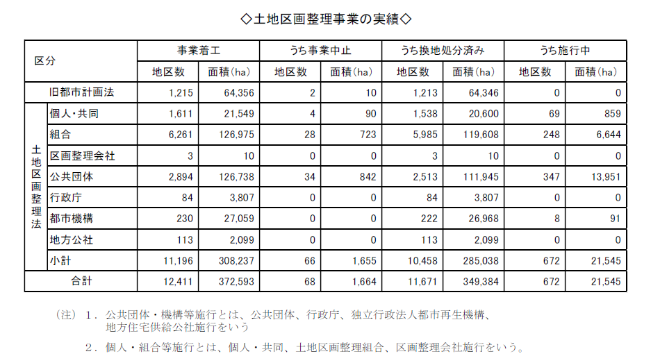 土地区画整理事業は、我が国の市街地整備を代表する手法として、戦前、戦後を通じ、多様な地域の多様な課題に対応すべく活用されており、2022年度末までに全国で約37万haの市街地整備を実施してきている。