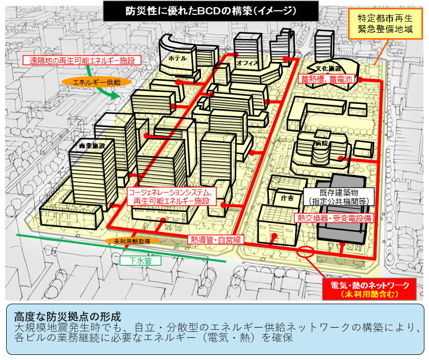 大都市におけるエネルギーの面的利用に係るネットワークにより、災害時の業務継続に必要なエネルギーの安定供給が確保される「業務継続地区(BCD:Business Continuity District)」の構築のため、都市再生安全確保計画に基づくエネルギー導管等の整備に必要な事業費の一部を支援する。