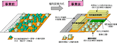 建築物への権利変換による土地・建物の共同化を基本としつつ、例外的に個別の土地への権利変換を認める柔軟かつ強力な事業手法を用いながら、老朽化した建築物を除却し、防災性能を備えた建築物及び公共施設の整備を行う。