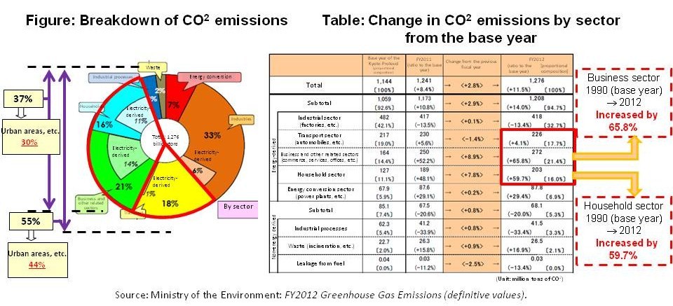 In particular, the increase in CO2 emissions in the business and household sectors is significant compared to other sectors. (The emissions in two sectors in 2012 increased by approximately 1.5 times the level of the base year.)