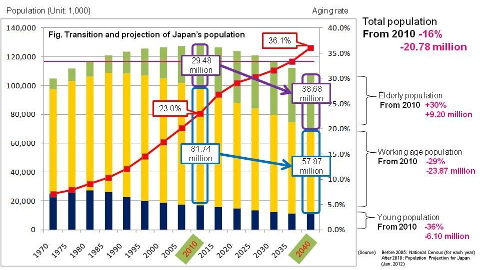 Japan’s population is forecasted to decline by about 20 million people in the next 30 years. During this period, the population will be aging and 1 in 3 people will be 65 years old or older in 2030.