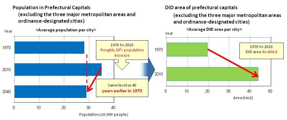The average DID area of prefectural capital cities expanded to double while the average population in those cities increased by 20% in the past 40 years.