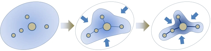 (イメージ)都心部を含め既に一定の都市機能が集積している地区を拠点とし、その周辺に居住等を集約していく。各拠点間は、公共交通で接続。