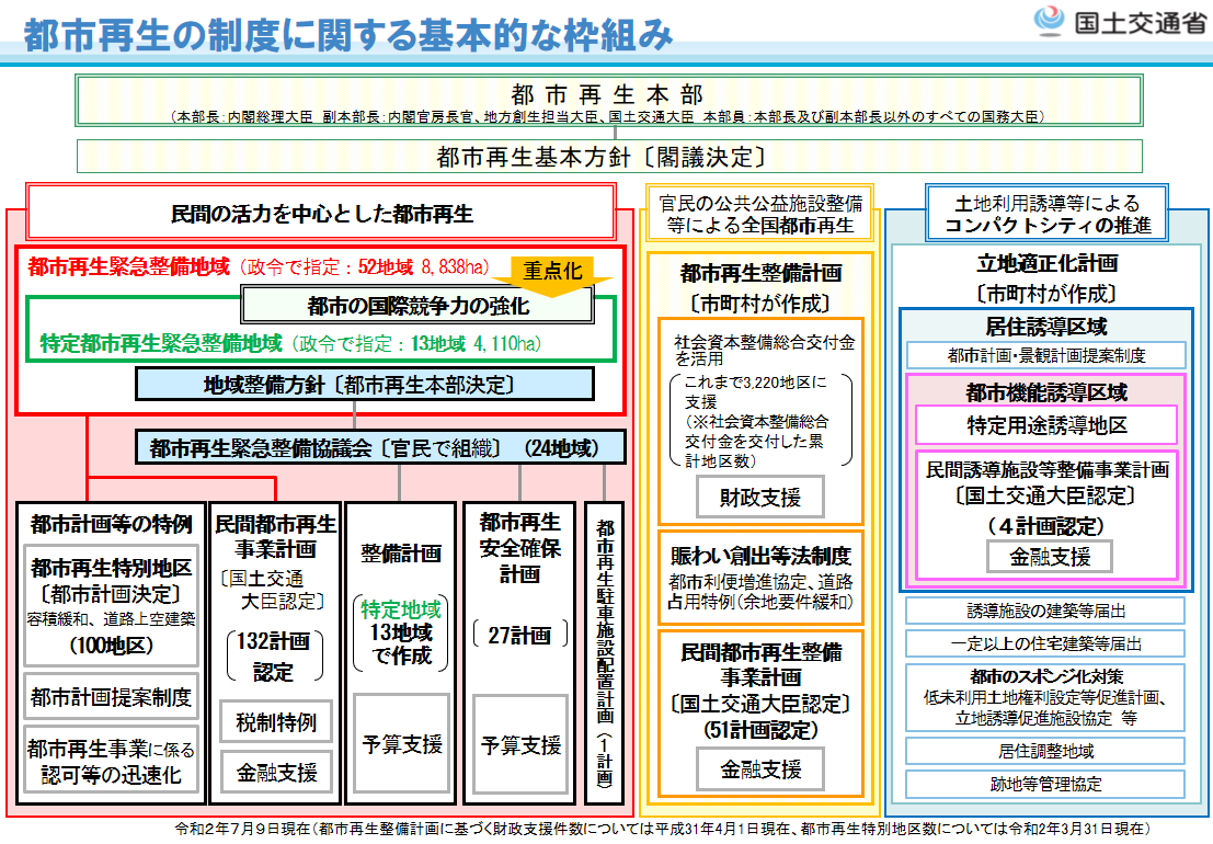 近年における急速な情報化、国際化、少子高齢化等の社会経済情勢の変化に我が国の都市が十分対応できたものとなっていないことにかんがみ、これらの情勢の変化に対応した都市機能の高度化及び都市の居住環境の向上を図り、併せて都市の防災に関する機能を確保するため、都市再生特別措置法(平成14年6月1日施行)が制定されました。
