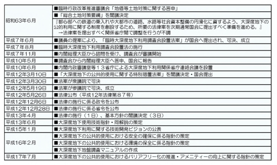 平成7年8月に「臨時大深度地下利用調査会設置法」が施行され、それに基づき「臨時大深度地下利用調査会」が3年間の期限をもって設置されました。 調査会は、その下に置かれた技術・安全・環境部会と法制部会での審議を合わせて、計43回の審議と国内外の現地調査を実施し、平成10年5月27日に答申をとりまとめました。 ここでは、調査会の答申を紹介します。