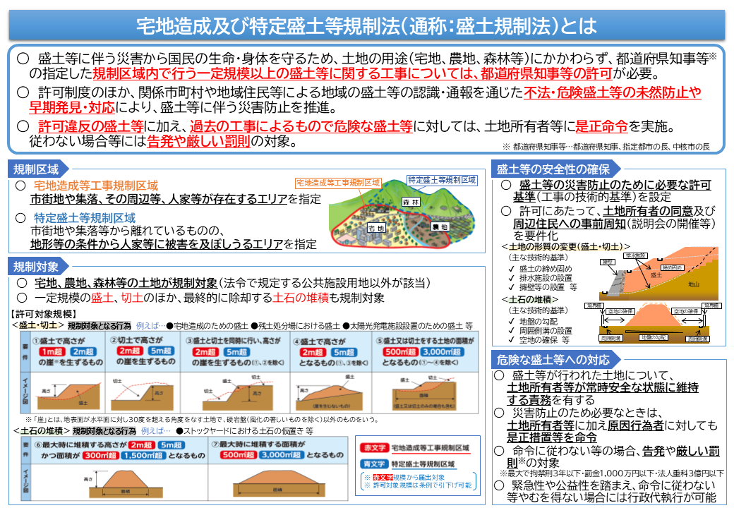 「宅地造成及び特定盛土等規制法」(昭和36年法律第191号。通称「盛土規制法」)の概要を紹介します。
