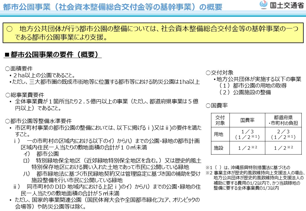 地方公共団体が行う都市公園の整備については、社会資本整備総合交付金等の基幹事業の一つである都市公園事業により支援。
