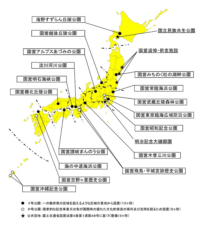 ○国営公園については、都市公園法に基づき、広域の見地から(イ号)、また、わが国固有の優れた文化的資産の保存及び活用を図るため(ロ号)、全国17公園において整備及び維持管理を実施。