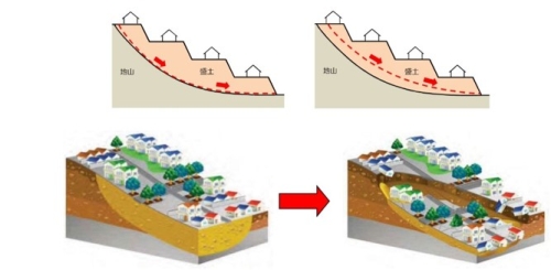 傾斜地盤上などにおいて高い盛土を行った 「腹付け型大規模盛土造成地」 においては、主として地震時に盛土造成地全体、または、大部分が斜面下部方向へ移動します。