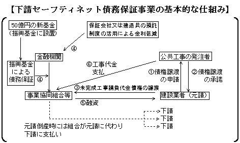 国土交通省においては、事業協同組合の金融事業に着目し、平成11年2月から、中小建設業者等への資金供給の円滑化及び下請保護等を図る「下請セーフティネット債務保証事業」制度をスタートさせている。この事業は、公共工事の請負代金債権の譲渡を受けて融資を行うリスクの低いものであり、このことにより、組合員への低利かつ安定的な資金供給が可能となるものである。対応可能な組合は積極的に利用されたい。