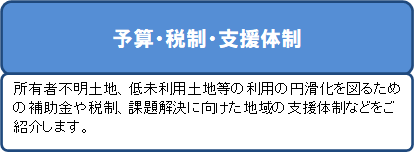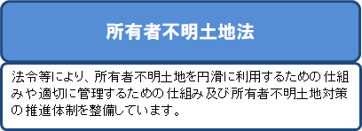 所有者不明土地等対策の推進のための関係閣僚会議」において決定された「所有者不明土地等対策の推進に関する基本方針」「所有者不明土地等問題 対策推進の工程表」に基づく取組が進められています。