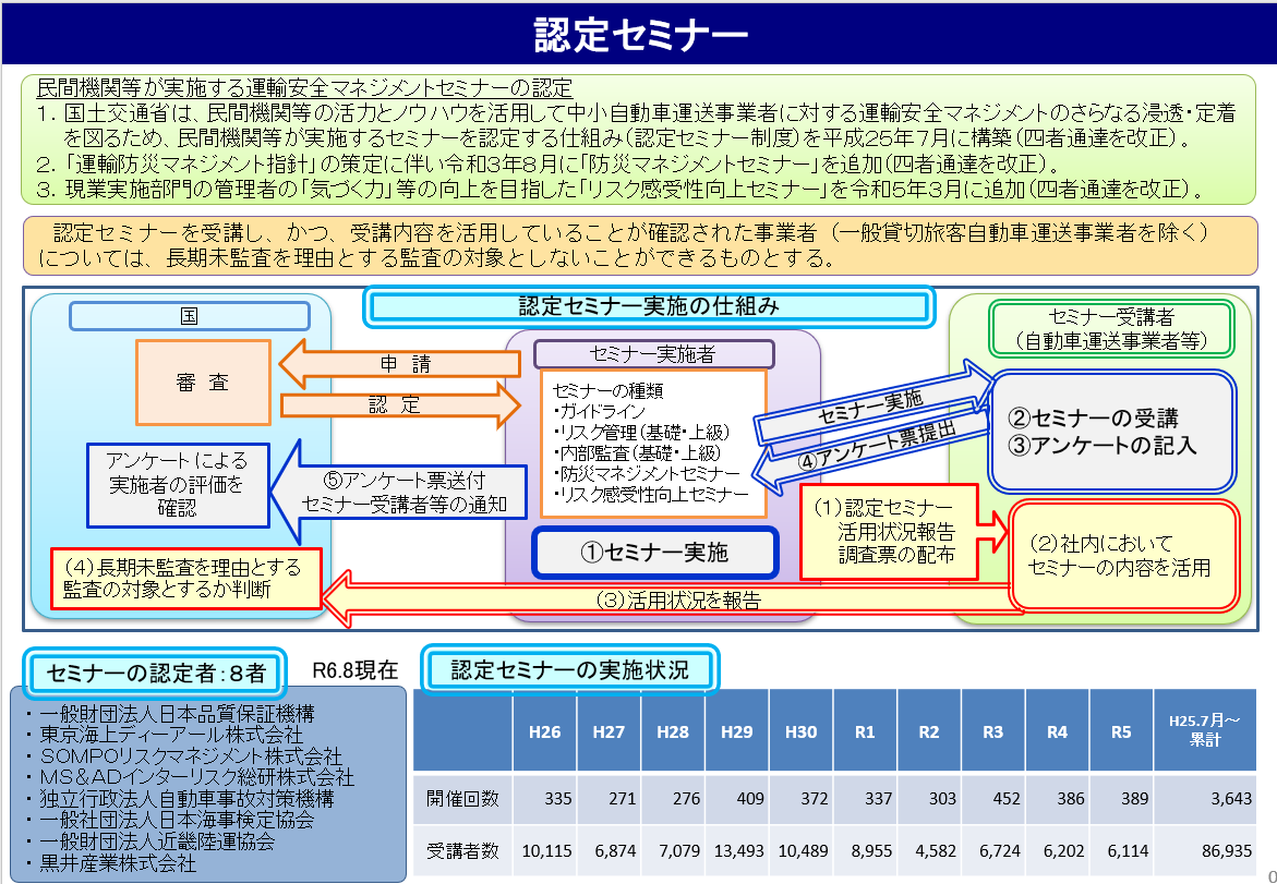 認定セミナーとは、運輸安全マネジメント制度の普及・啓発を図るため、民間機関等が実施する運輸安全マネジメントセミナー等の中で、一定の基準を満たし、事業者の安全管理体制の構築・強化に有効であると国土交通省が「認定」したセミナーです。