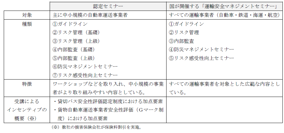 「認定セミナー」と国土交通本省及び地方運輸局等が開催する「運輸安全マネジメントセミナー」との相違は以下の通りです。